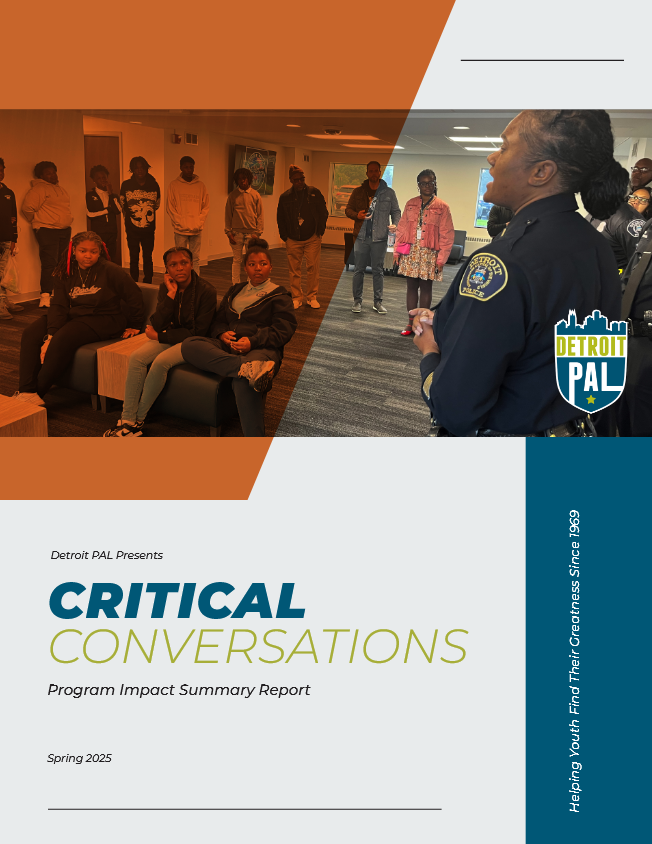 The Critical Conversations program gives a voice to youth to promote positive police-community relations and strengthen communities. It brings law enforcement officers into classrooms for facilitated discussions with youth on topics such as the role of police, police misconduct, and media influence. Detroit PAL has implemented this program in area schools to create a path toward community healing in response to violent encounters with law enforcement. This summary report was created collaboratively, leveraging in-house graphic design resources and our technical assistance and support.