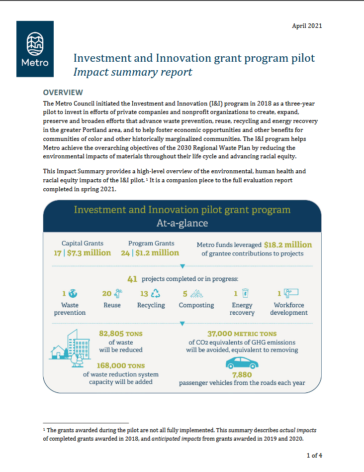 Portland, Oregon’s regional government launched a three-year pilot to invest in private-sector innovation in waste management while fostering economic equity. This report, which includes both an Impact Summary and a detailed Pilot Evaluation Report, assesses the cumulative impacts of these public investments and evaluates how well the program met its goals. Metro staff wrote the report, with technical assistance and data visualization by Evaluation into Action.