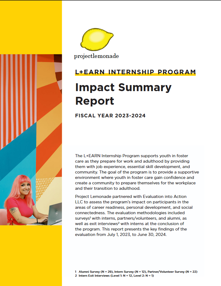 Project Lemonade inspires self-esteem to help youth in foster care thrive. Their L+EARN Internship program supports youth experiencing foster care to prepare for work and adulthood by providing them with job experience, essential skill development, and community. We created a plan to assess impact in three program areas: career readiness, personal development, and social connectedness. The evaluation results demonstrated significant gains in these areas and revealed a path toward developing more customized programming to meet the needs of the youth they serve.